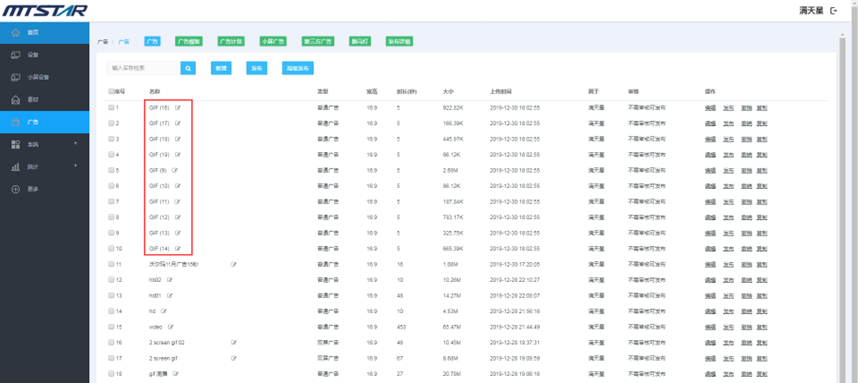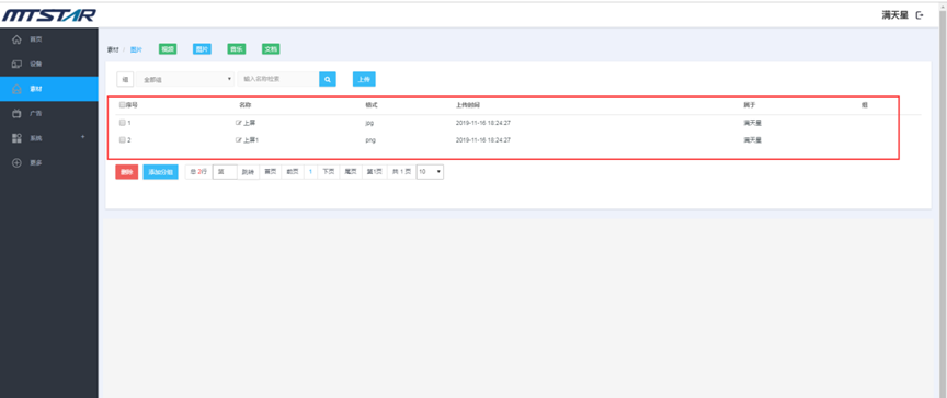 上传成功后素材会添加到对应类型的素材列表,附带文件名称,文件格式,上传时间