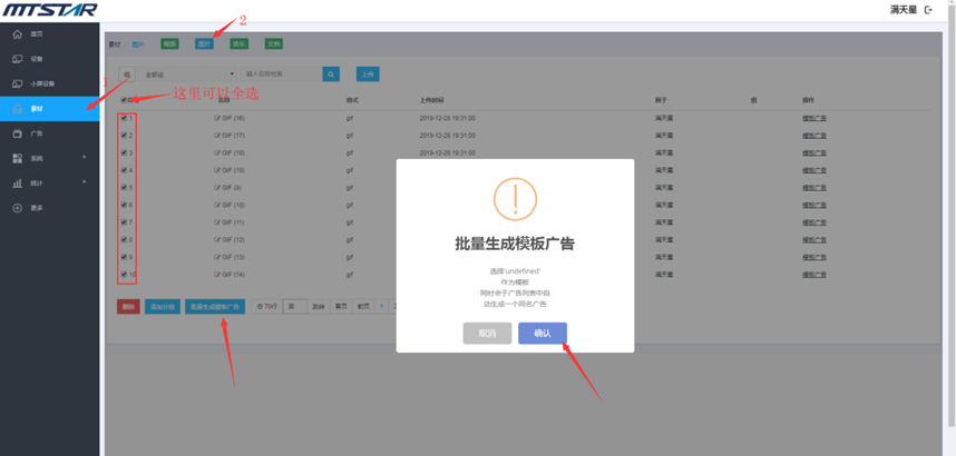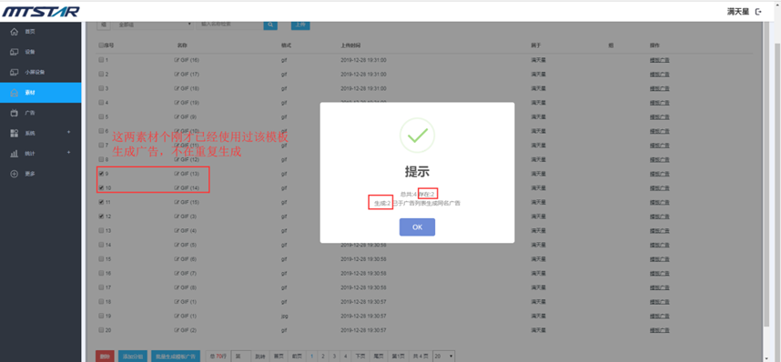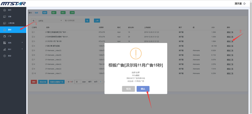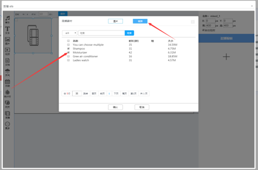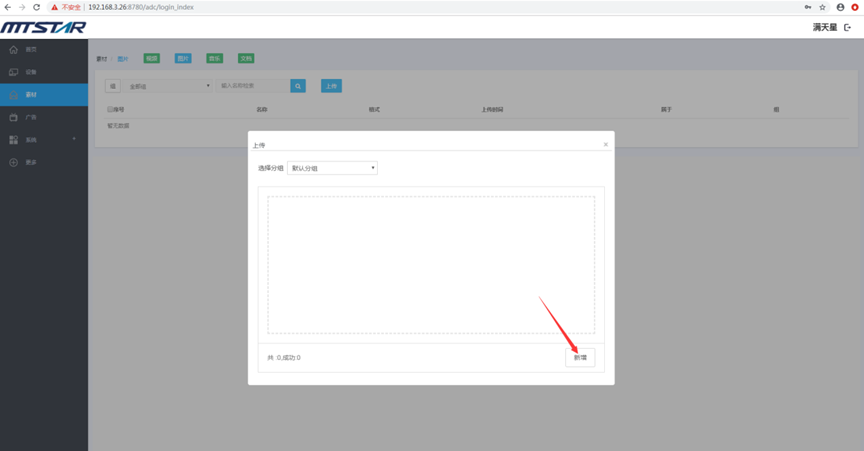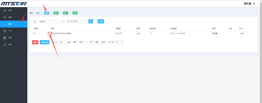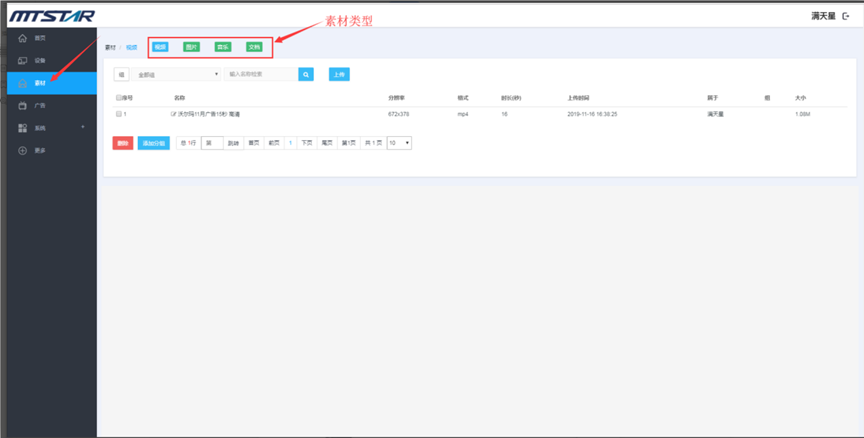 比如说,在视频素材管理页面上传视频格式的文件,在音乐素材管理页面上传音乐格式的文件