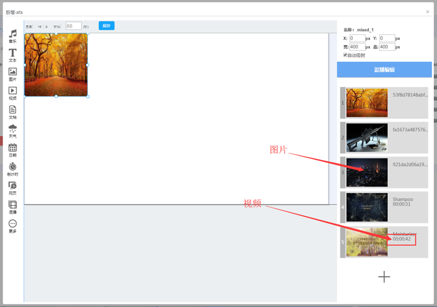 您可以添加图片、视频、背景音乐、文本、文档、天气、日期、计数、网页、视频和 图片混合、数据接口、第三方广告和流媒体广告等