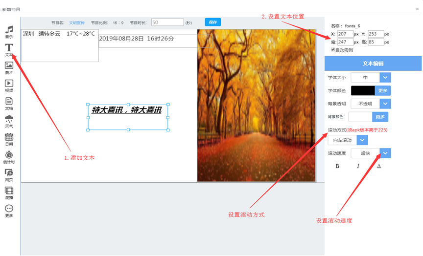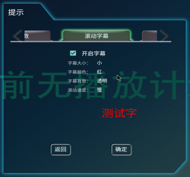 位置:满天星播放程序菜单页面 高级 --> 单机节目 --> 滚动字幕(标题栏左滑)