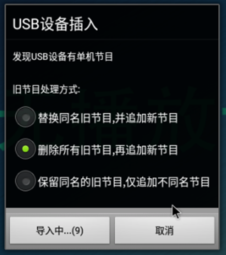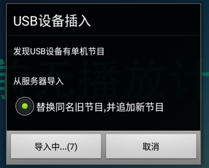 将有节目包的U盘插入设备USB口等待导入完成,导入完成后至少5秒才替换节目