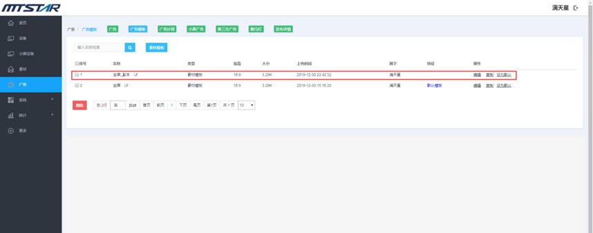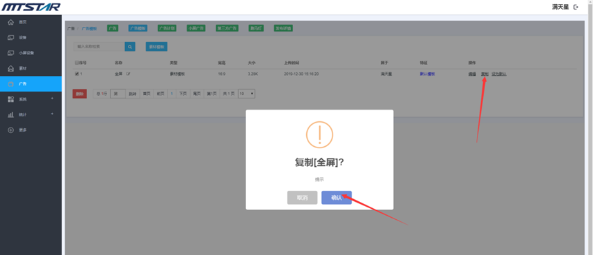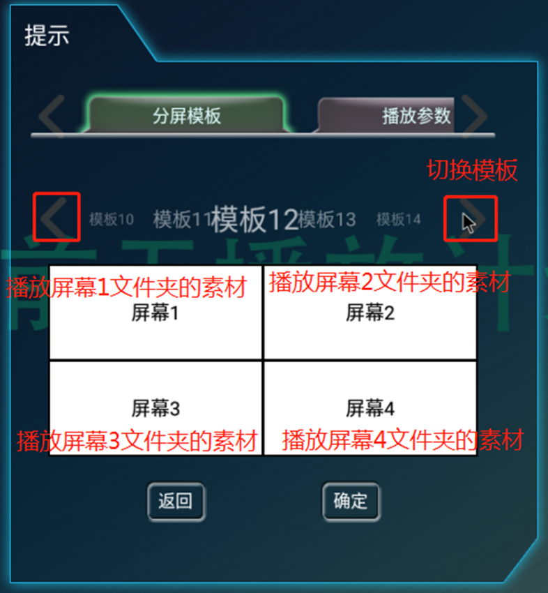 2:左右滑动模板名称选择播放模板,点击确认即可使用模板(注意:U盘的文件夹“屏幕1”对应模板中的“屏幕1”播放区域播放,屏幕2文件夹对应 屏幕2播放区域, 以此类推)