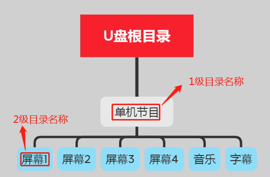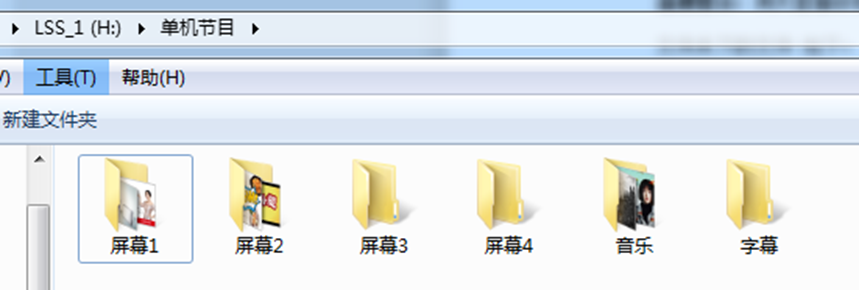手动创建:电脑上在U盘根目录创建名称为“单机节目”的文件夹,再在单机节目文 件夹下创建名称为 “屏幕1”、“屏幕2”、“屏幕3”、“屏幕4”、“音 乐”、 “字幕”这几个文件夹