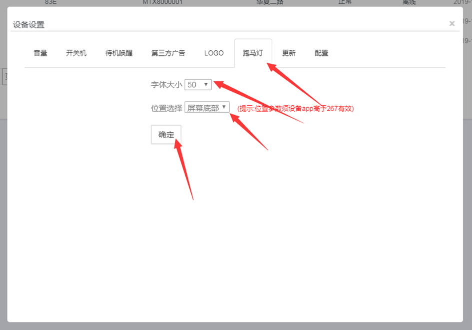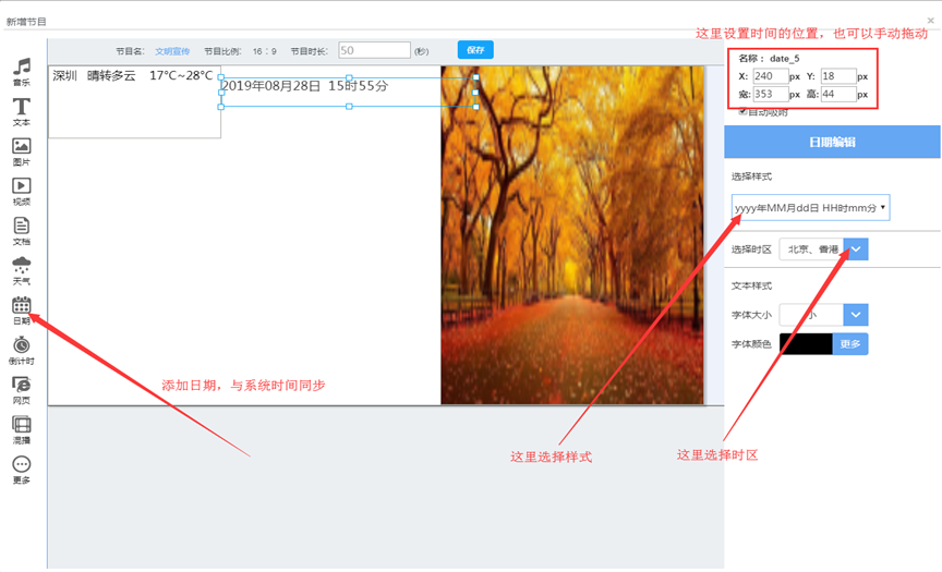 播放节目时需要在最上层显示时间或设备名则勾选显示时间或设备名,选择字体样式显示位置点确认保存