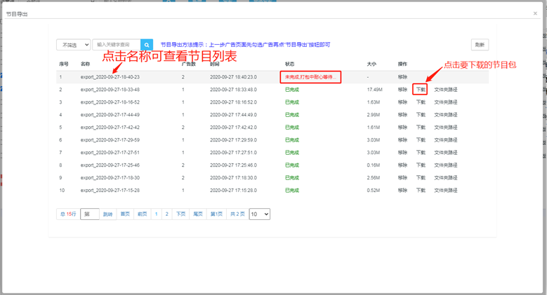 1)等待节目包生成完成后,点击下载节目包(注意:如果节目文件被删除了是无法生 成节目包的)