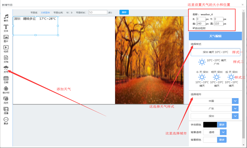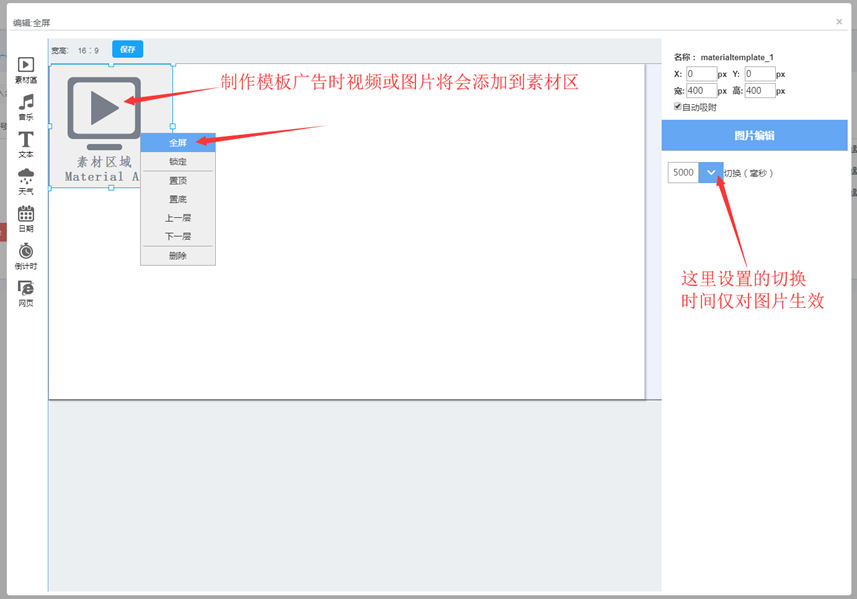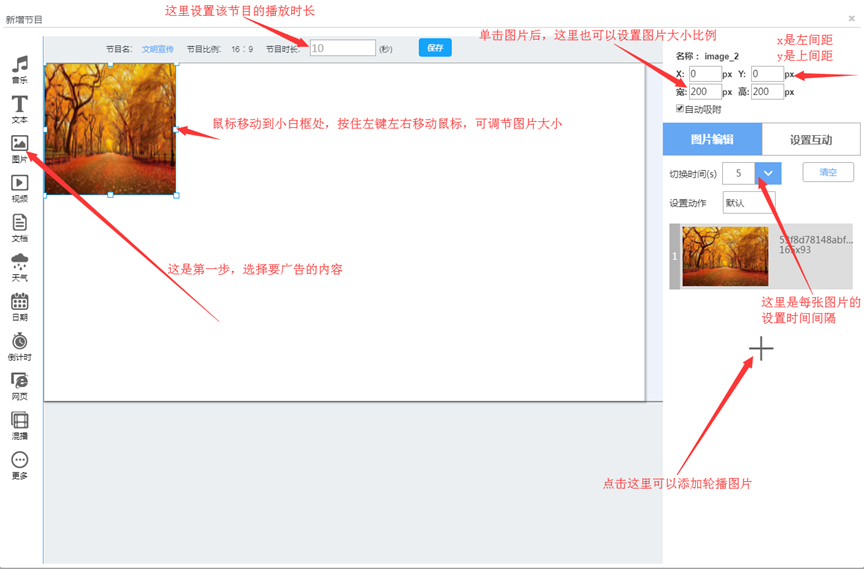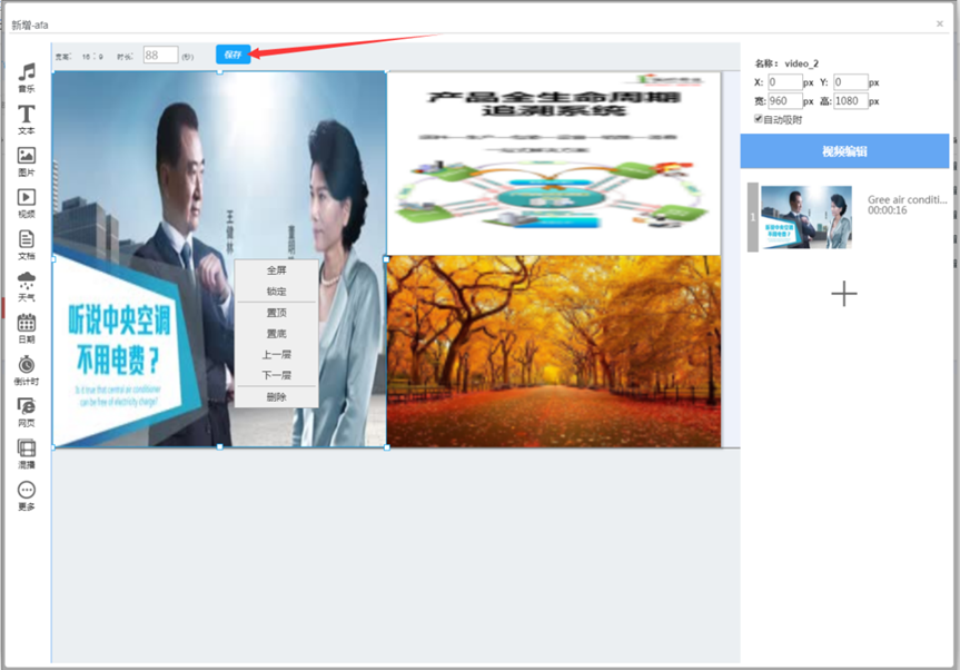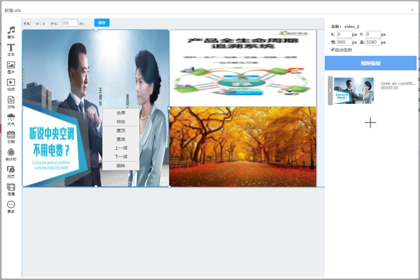 自定义制作广告,支持双屏节目、可自定义广告宽高、支持多窗口播放、 支持视频、图片、背景音乐、文本播放、文档、天气、日期、倒计时、网页、 视频图片混合播放、数据接口、支持第三方流媒体,第三方广告等功能