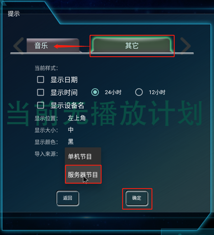 注意:需要确认单机导入的默认是U盘节目还是服务器节目,满天星播放程序菜单页面 高级 --> 单机节目 --> 其他(标题栏左滑) 查看导入来源是否是单机节目