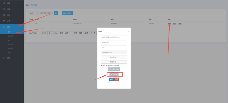 用户管理页面,编辑下级用户信息,选择管理区域,点击确认