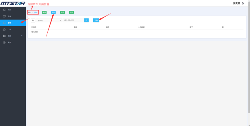 素材管理页面选择并点击您要上传的素材类型,如果您要上传图片,您需要在图片 - 素材管理页面,点击“上传”