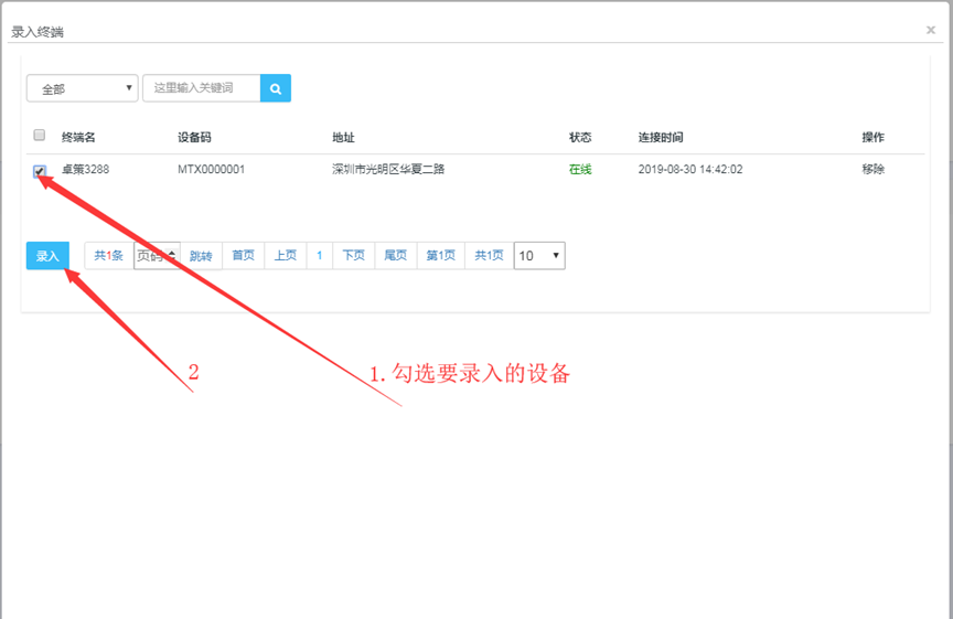 勾选要录入的设备,点击“录入”(首次指向服务器或被删除后的设备都会在未录入设备列表中)