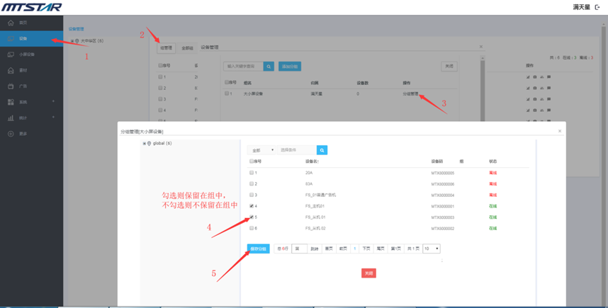 设备管理页面点击分组管理,选择要管理的组并点击后面的“分组管理”,勾选要保留在组中的设备,点击保存分组