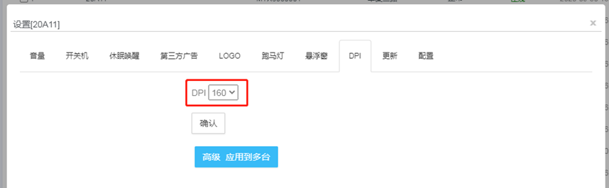 设备设置页面点击DPI,选择DPI值,您可以点击确认设置当前设备DPI为160,也可点击应用多台设备,选择要应用的设备,点击确认应用